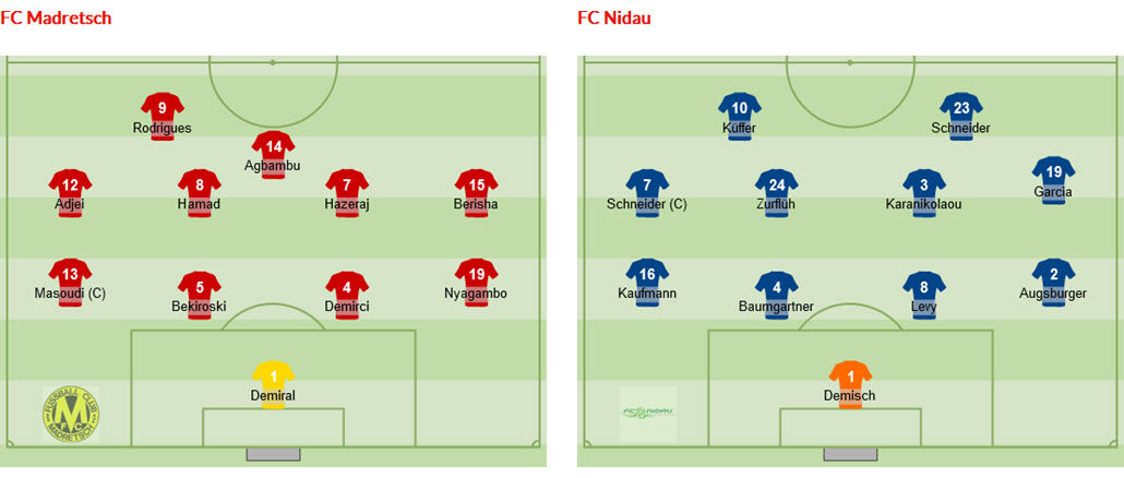 Madretsch: Demiral; Nyagambo, Demirci, Bekiroski, Masoudi; A. Berisha, Hazeraj, A. Hamad, Adjei; Agbambu, Rodrigues.