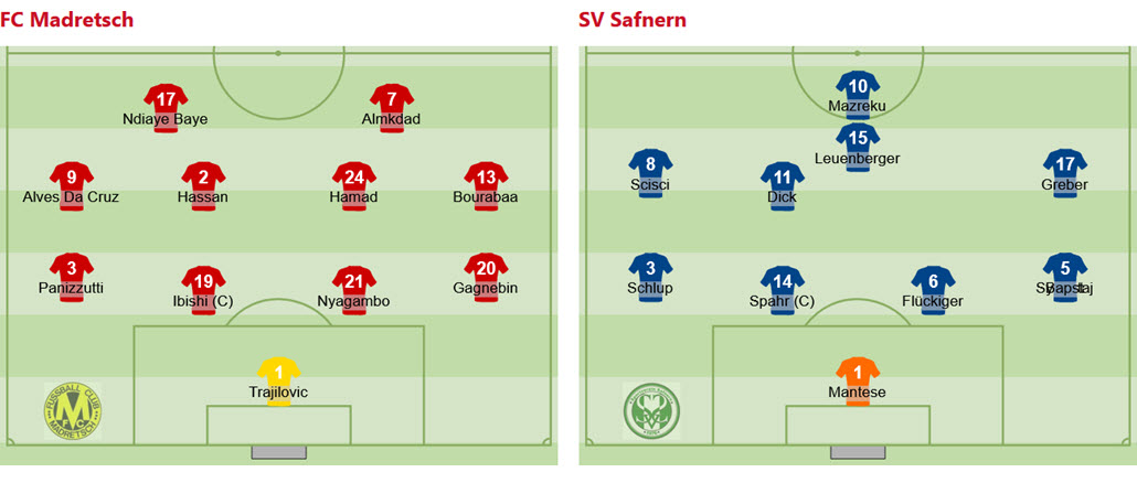Madretsch: Trajilovic; Gangebin, Nyagambo, Ibishi, Panizutti; Bourabaa (81. J. Hamad), J. Hamad (32. I. Zumberi), Hassan, Da Cruz (71. E. Celik); Almkdad (89. Da Cruz), Ndiaye.