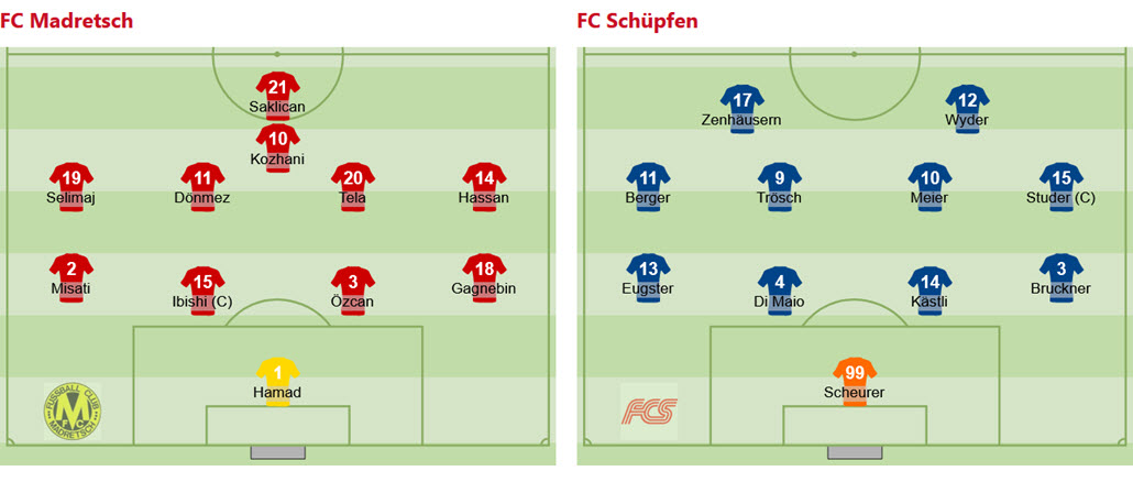 Madretsch: S. Hamad; Gagnebin, Özcan, Ibishi, Misati; Hassan, Tela, Dönmez, Selimaj; A. Kozhani, Saklican.
